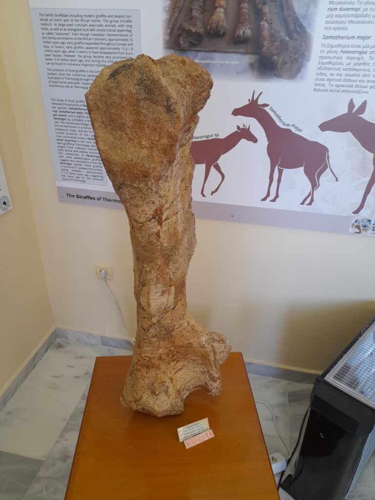 Ήταν τότε που ο σιδηροδρομικός, Γιώργος Τομπουλίδης, παρατήρησε απολιθωμένα οστά ζώων σε ένα μονοπάτι, στη θέση Πευκάκια της Θερμοπηγής. Ένα χρόνο μετά, το 1998, έφερε ένα δείγμα στο ΑΠΘ. Η τυχαία συνάντησή του με την παλαιοντολόγο, Δρ. Ευαγγελία Τσουκαλά και η μελέτη που ακλούθησε από την ίδια, έδειξε πως επρόκειτο για ένα απολίθωμα προϊστορικής καμηλοπαρδάλης που παρουσίαζε μεγάλο επιστημονικό ενδιαφέρον.